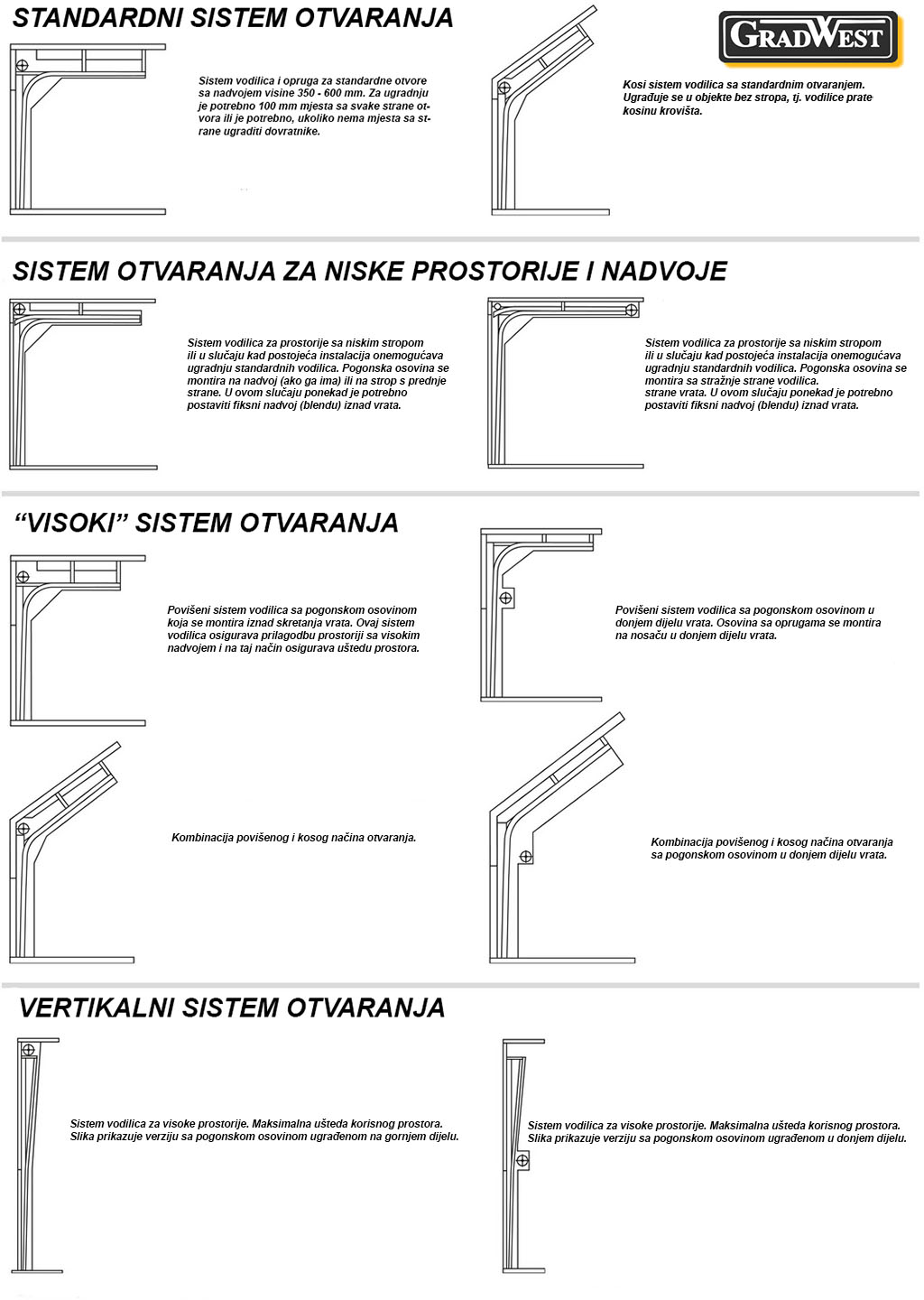 Svaka vrata izrađujemo po mjeri otvora što osigurava maksimalnu funkcionalnost. Torzione opruge su proračunate na min. 50.000 ciklusa otvaranja pa sve do 100.000 ciklusa kod nekih modela! Evo nekih primjera na koji se sve način mogu montirati vodilice kod sekcijskih vrata: